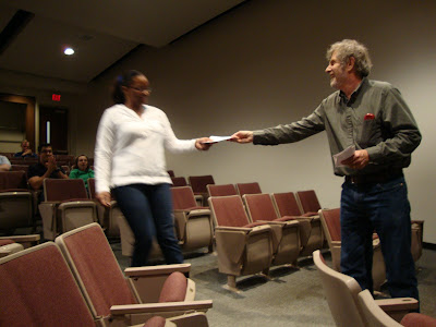 Cheryl Lynn receiving an envelope from Dept. Head Gary McCracken